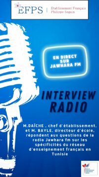 L’établissement français Philippe Séguin est sur Jawhara FM M.DAÏCHE , chef d’établissement et M. BAYLE, directeur d’école, répondent aux questions de la radio Jawhara FM sur les spécificités du...