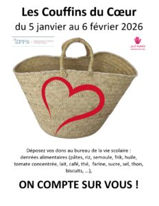 Nous avons le plaisir de vous informer que l’opération « Les Couffins du Cœur » sera organisée au sein du collège du lundi 5 janvier au vendredi 6 février 2026.