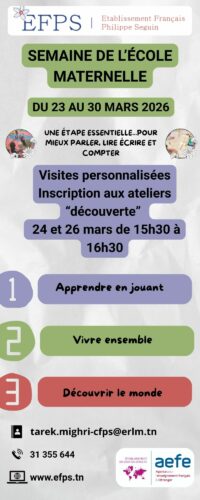 L’établissement français Philippe Séguin de Sousse vous propose de découvrir ses locaux sur rendez-vous pour des visites personnalisées et organise à l’occasion de la semaine de l’école maternelle du 23 au 30 mars des rencontres et des ateliers découverte avec les parents et leurs enfants sur inscription auprès de notre secrétariat.